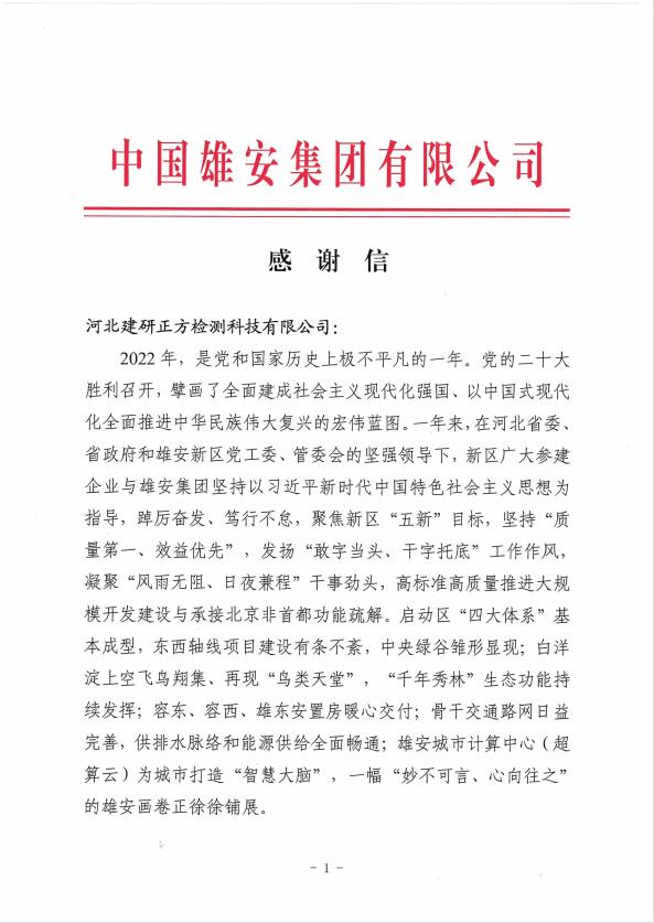 近日,建研正方公司收到雄安集團發來的感謝信,對建研正方公司2022年為雄安新區發展建設所做出貢獻表示感謝。